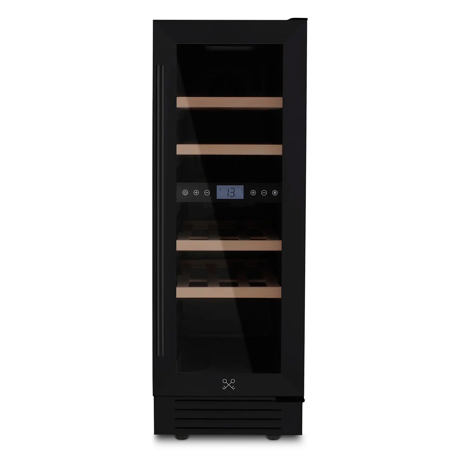 Com capacidade para 17 garrafas (0,75 L tipo Bordeaux) e 4 prateleiras de madeira, a cave de vinho aproveita ao máximo o seu volume sem renunciar a um armazenamento seguro, estável e elegante. O seu tamanho compacto permite integrá-la mesmo em cozinhas com pouco espaço.