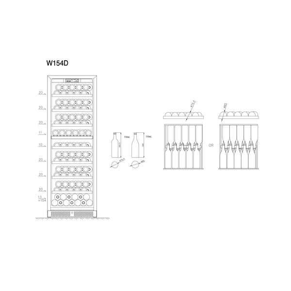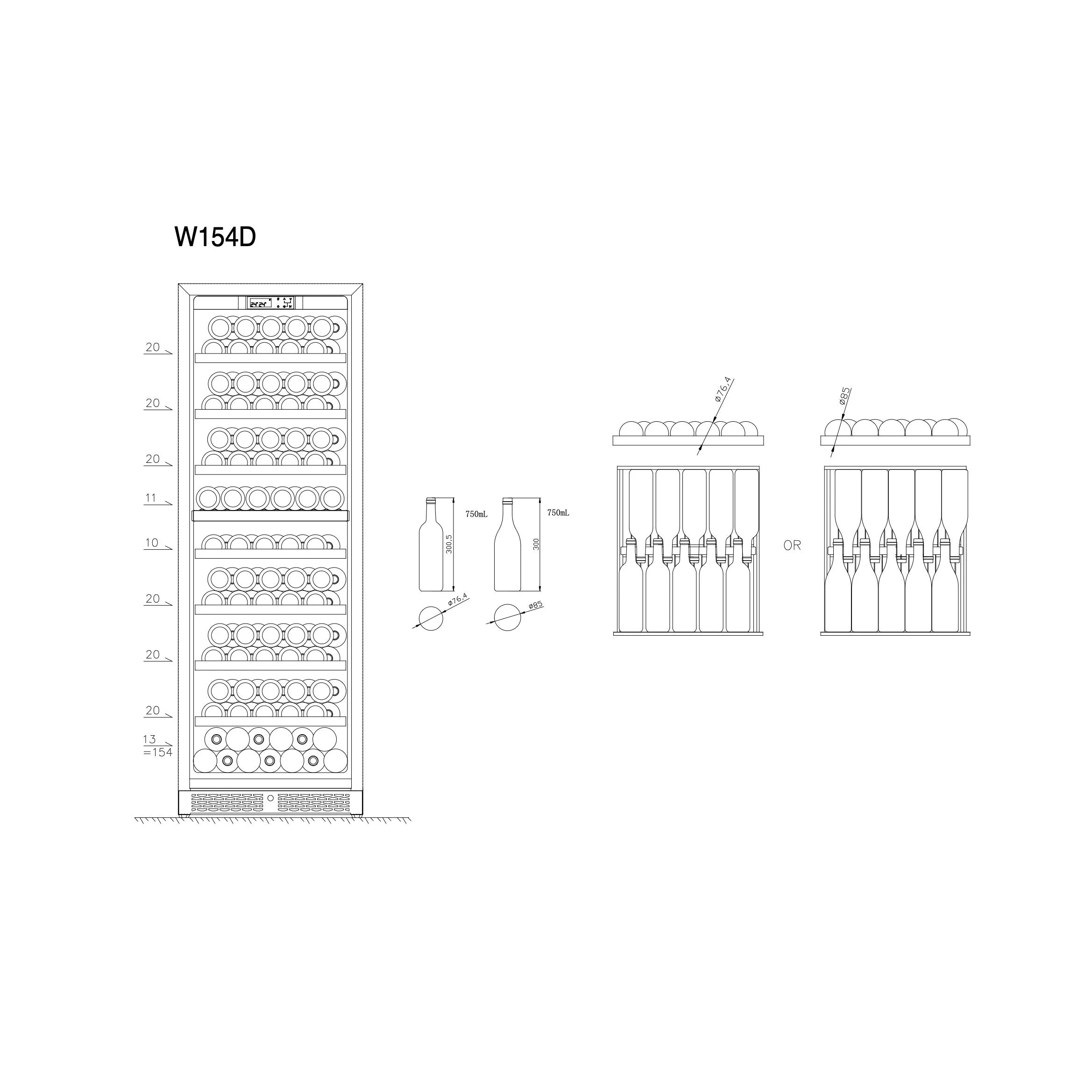 • Capacidade: 154 garrafas (750 ml, garrafas tipo Borgonha – máximo 85 mm de diâmetro)