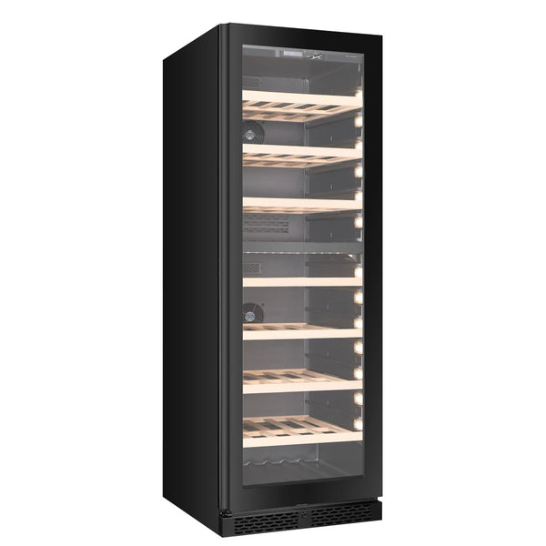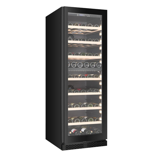 A cave de vinho CELLA W154D Black permite armazenar até 154 garrafas em duas zonas de temperatura independentes, com controlo digital, iluminação LED, instalação embutida ou independente, e um sistema de refrigeração silencioso com compressor antivibração.