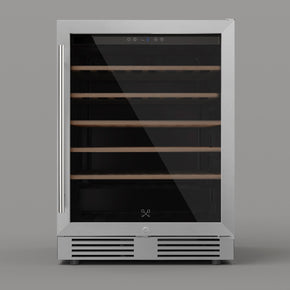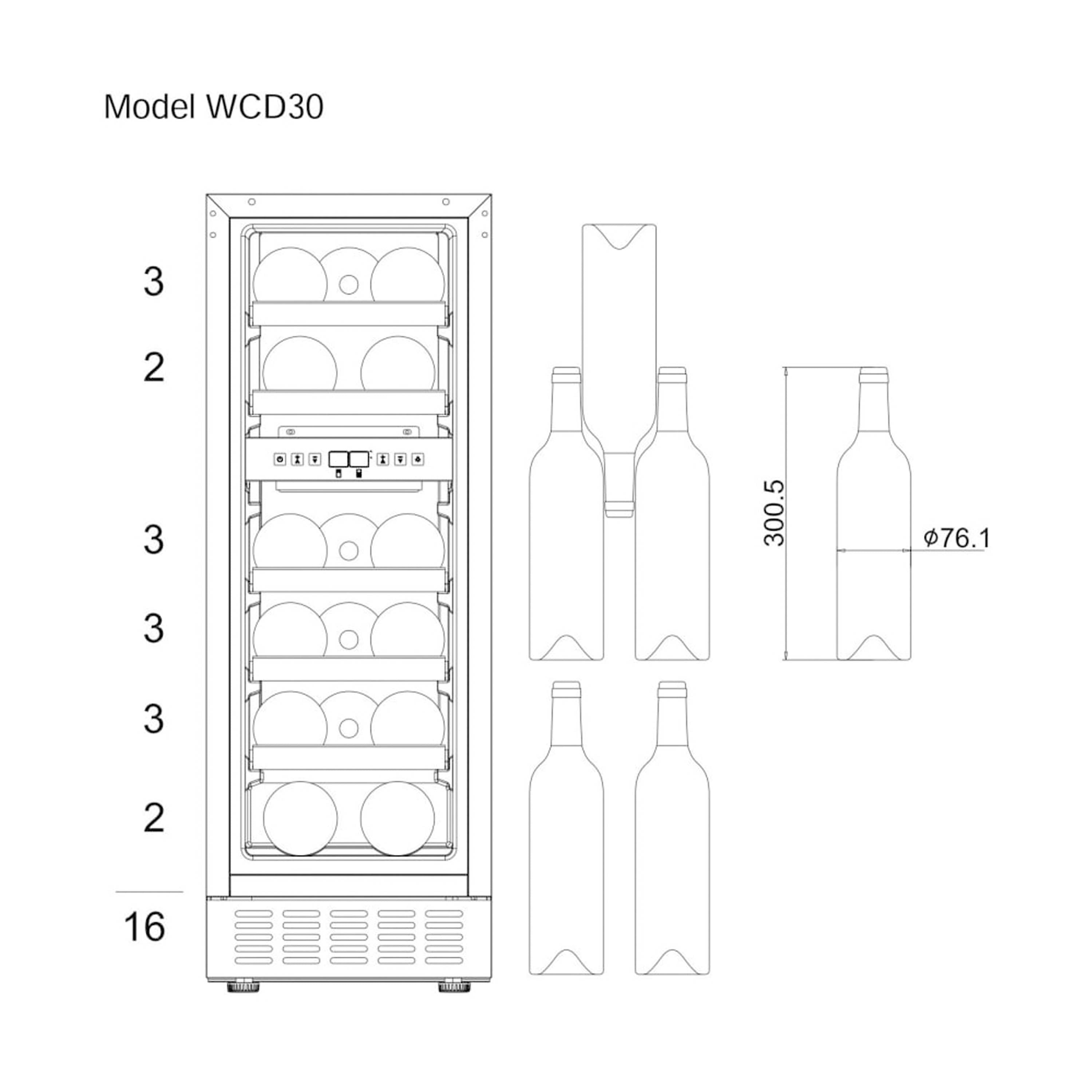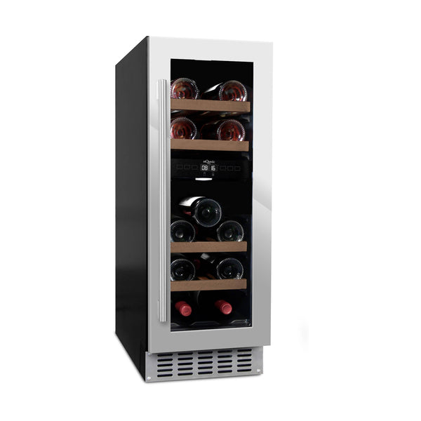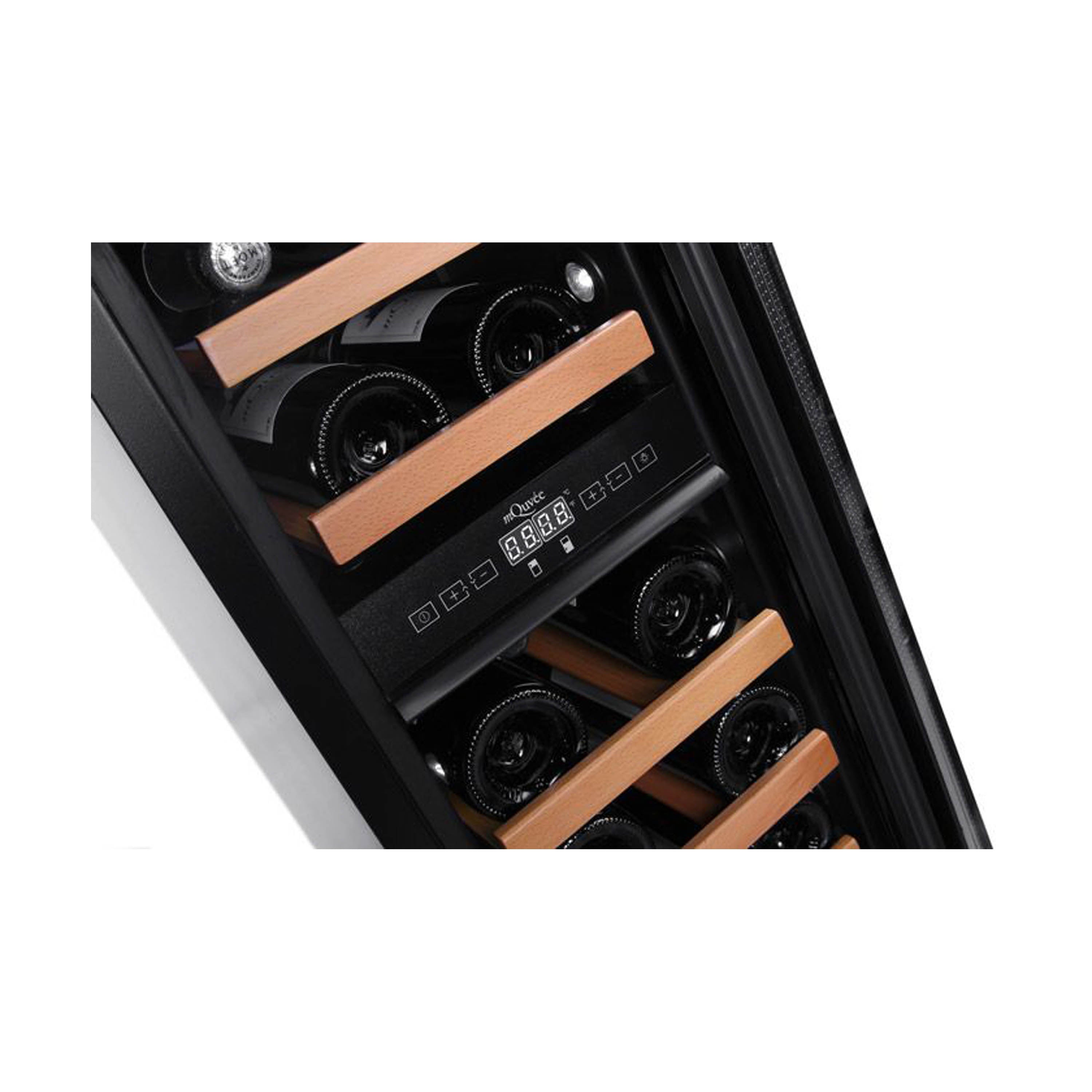 Cave de vinho elegante e energeticamente eficiente da mQuvée, encaixável embaixo da bancada. Possui duas zonas de temperatura, filtro de carbono, 5 prateleiras de madeira removíveis e espaço para 16 garrafas.