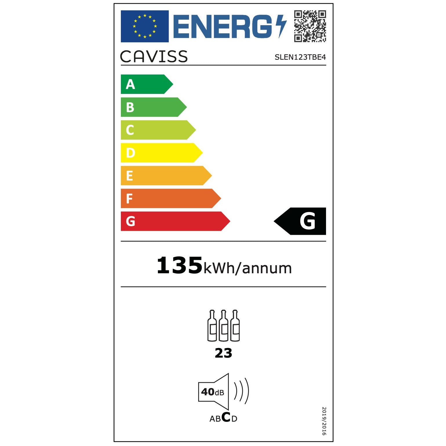 O Cave de vinho Caviss SLEN123TBE4 possui 2 prateleiras de madeira e capacidade para 23 garrafas de vinho. É ideal para a sua cozinha, com baixo consumo, apenas 138 kWh / ano permitem-lhe manter as suas garrafas de vinho a uma temperatura óptima de serviço entre 5ºC - 20ºC.