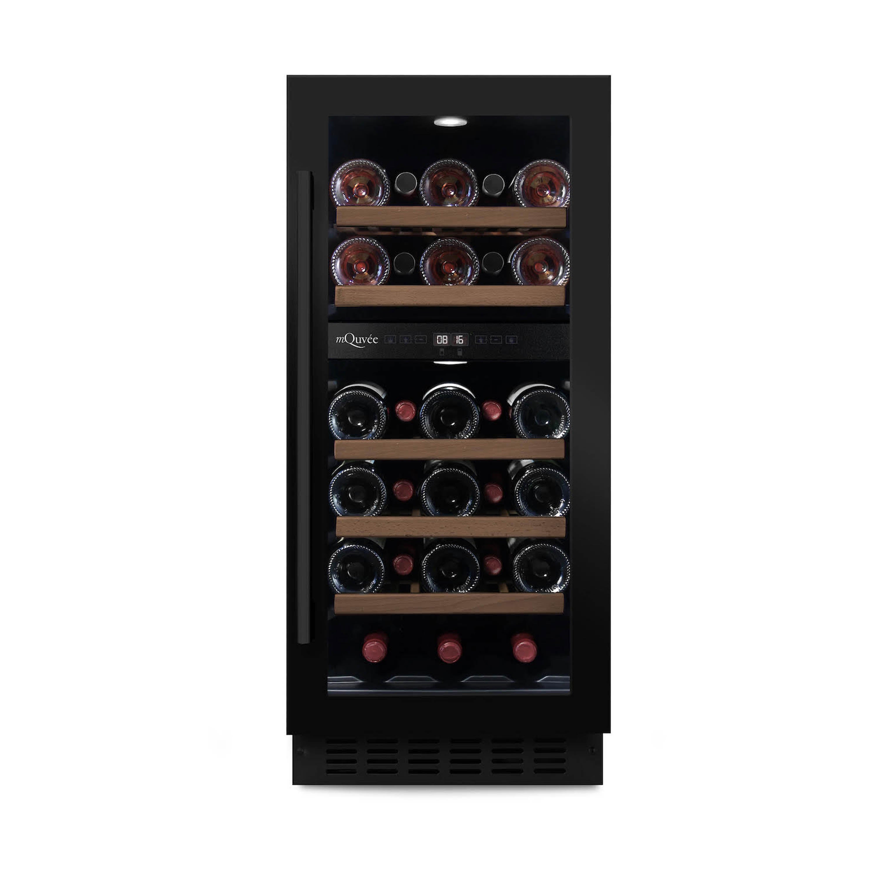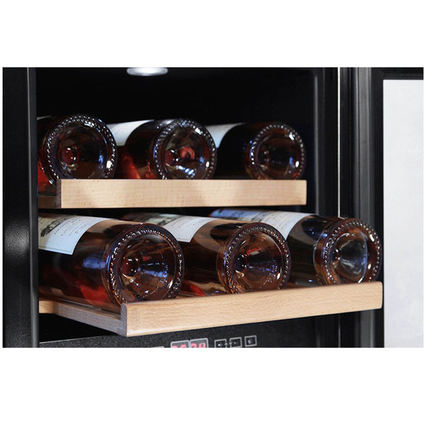 Inclui duas áreas de temperatura e 5 prateleiras extensíveis de madeira com espaço para 28 garrafas. A temperatura é regulada no display digital, que também permite ajustar a iluminação das fileiras de LED no interior da adega. A adega está equipada com um compressor de inversão, que oferece um menor consumo, uma regulação térmica mais rápida e um nível de ruído mais reduzido e uniforme.