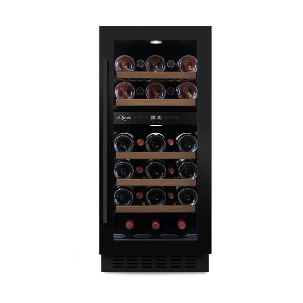 Adega de baixo consumo da mQuvée com acabamento exclusivo em preto fosco. A porta da adega encaixa perfeitamente com o resto da cozinha, com um efeito totalmente integrado e elegante. Seu design elegante permite combinar essa adega com qualquer tipo de cozinha.