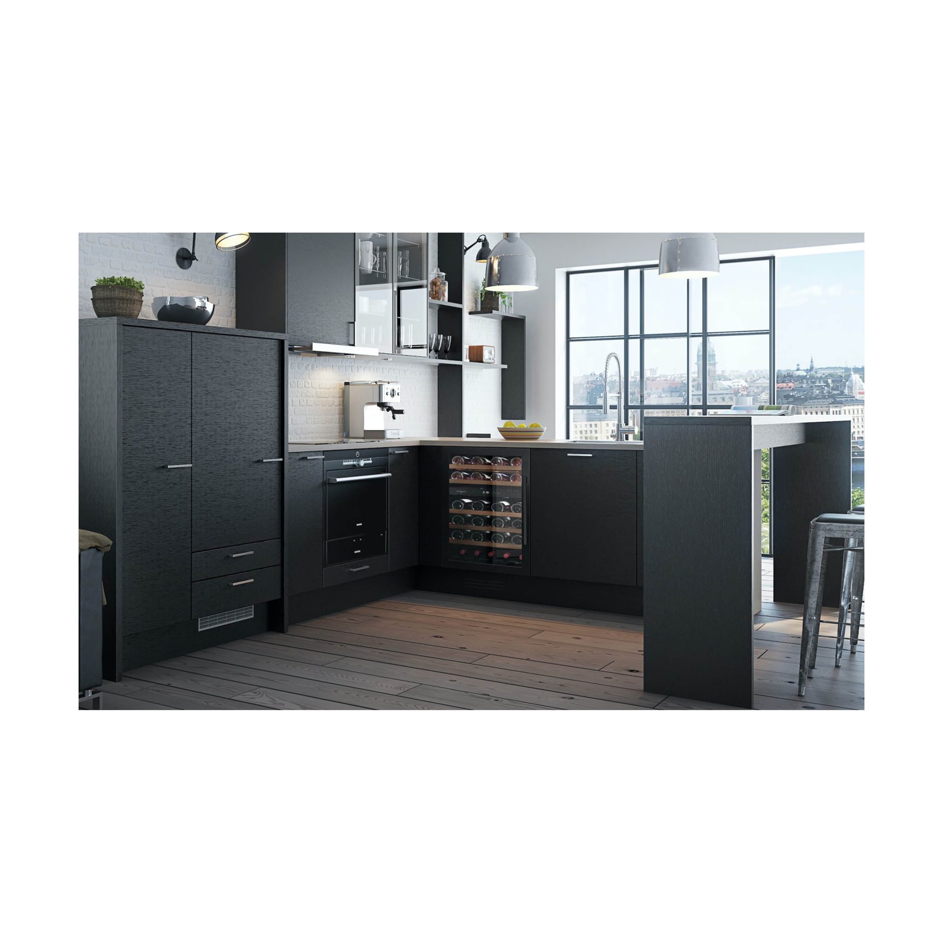 A porta da adega encaixa perfeitamente com o resto da cozinha, com um efeito totalmente integrado e elegante. Seu design elegante permite combinar esta adega com todos os tipos de cozinhas.