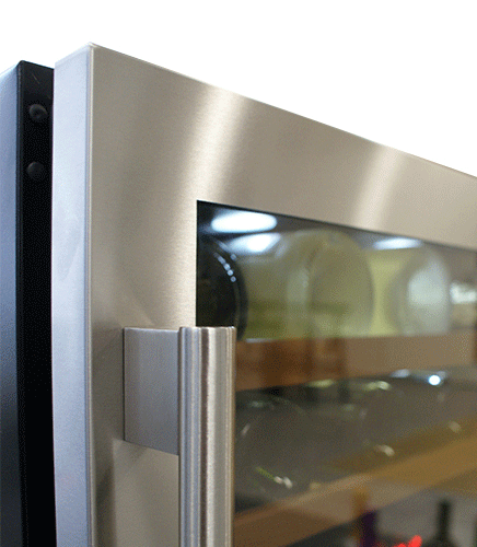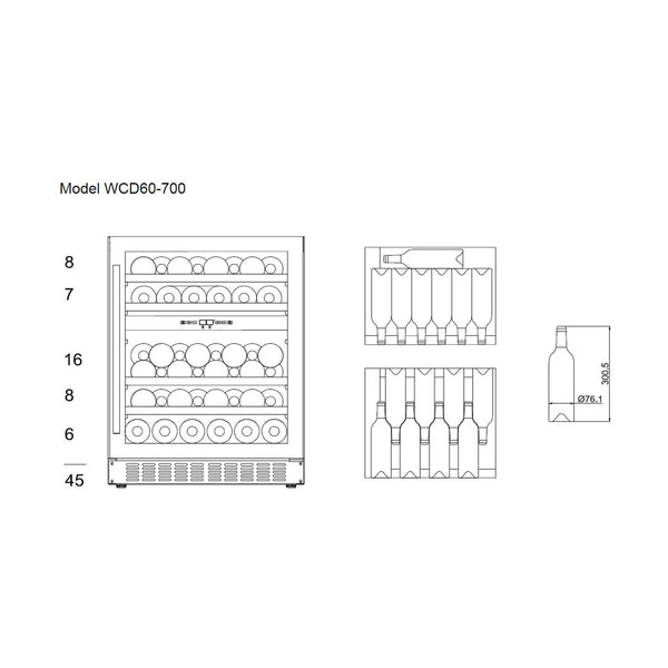 Possui uma única porta de 700 mm de altura para se adaptar às casas europeias. O refrigerador de vinho pode ser facilmente embutido abaixo da bancada da cozinha ou de forma independente. Com um elegante design de aço inoxidável, duas áreas de temperatura e uma porta sem juntas, este refrigerador de vinho elevará toda a sua cozinha. A vinoteca possui classificação energética A e conta com um filtro de carvão, 4 prateleiras de madeira removíveis e espaço para 45 garrafas.