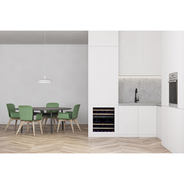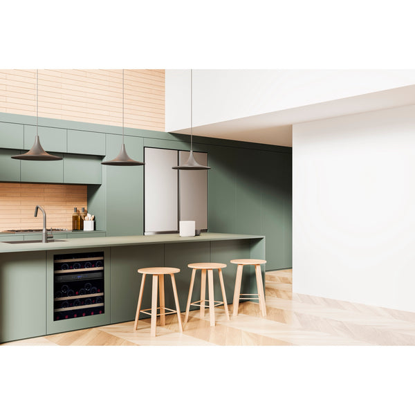 Cave de vinho panel ready com capacidade para 45 garrafas, ideal para integrar em qualquer espaço. Conta com porta reversível, controle digital de temperatura e sistema de refrigeração por compressor com ventilação. Funciona de maneira silenciosa e oferece um design elegante na cor preta.