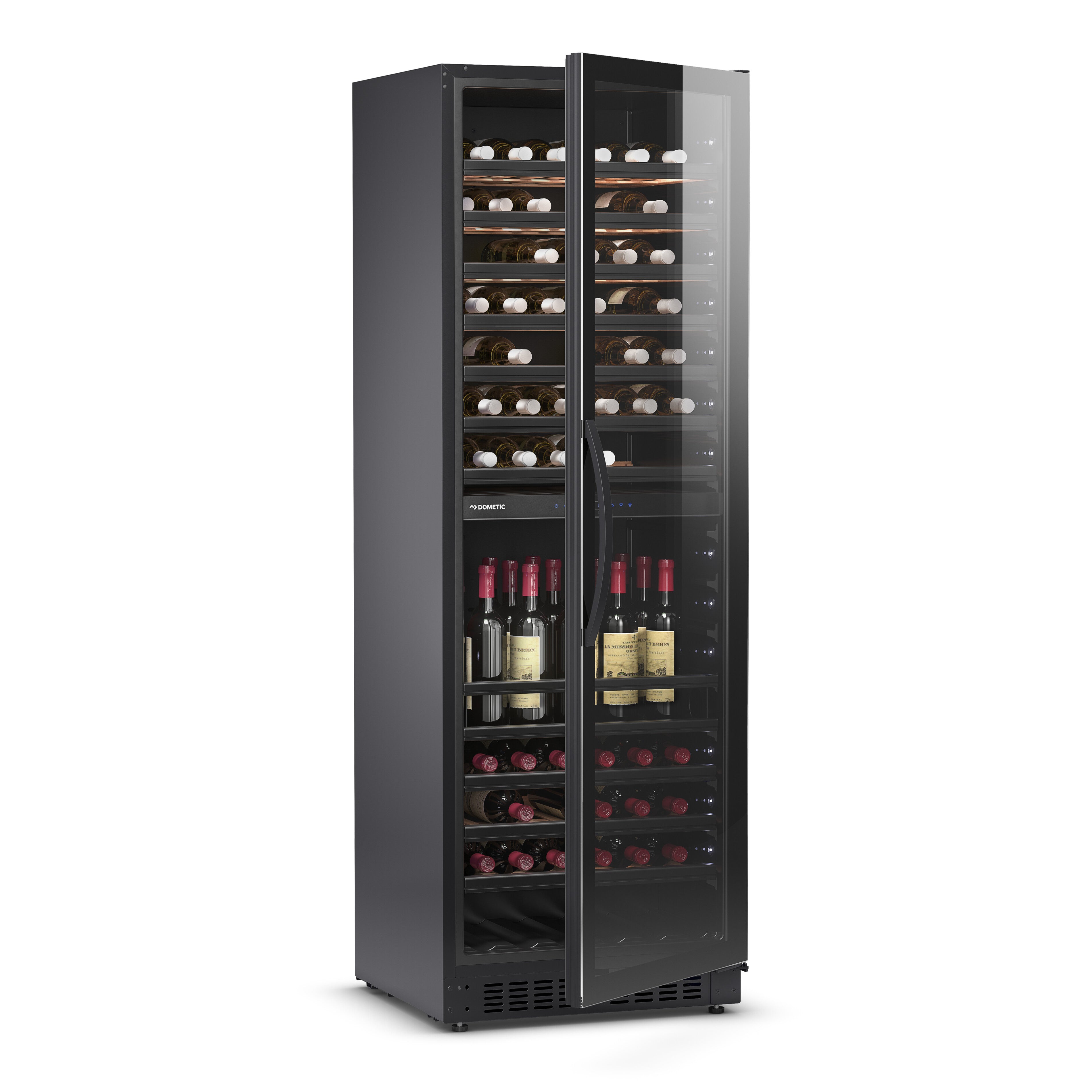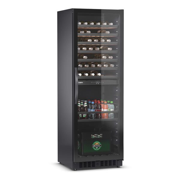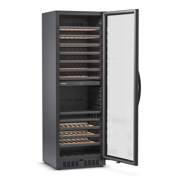 A E115FG da Dometic tem 2 zonas de temperatura distintas que podem ser definidas conforme necessário – para vinhos tintos encorpados, brancos, champanhe ou outras bebidas refrigeradas. As prateleiras deslizantes de alta qualidade permitem um acesso conveniente e uma gaveta de servir para garrafas abertas vem incluída de fábrica, existindo a opção de adicionar uma segunda. Este espaçoso refrigerador de vinho tem luzes LED em ambos os lados e armazena 115 garrafas de vinho detrás da sua porta de vidro sem moldura com filtro de luz UV. A bem concebida tecnologia de aquecimento e refrigeração garante que a temperatura escolhida é rapidamente alcançada e mantida de forma fiável. O sistema de circulação de ar eficaz, o filtro de carbono e o reservatório de água criam o ambiente perfeito para o seu vinho desenvolver todo o potencial.