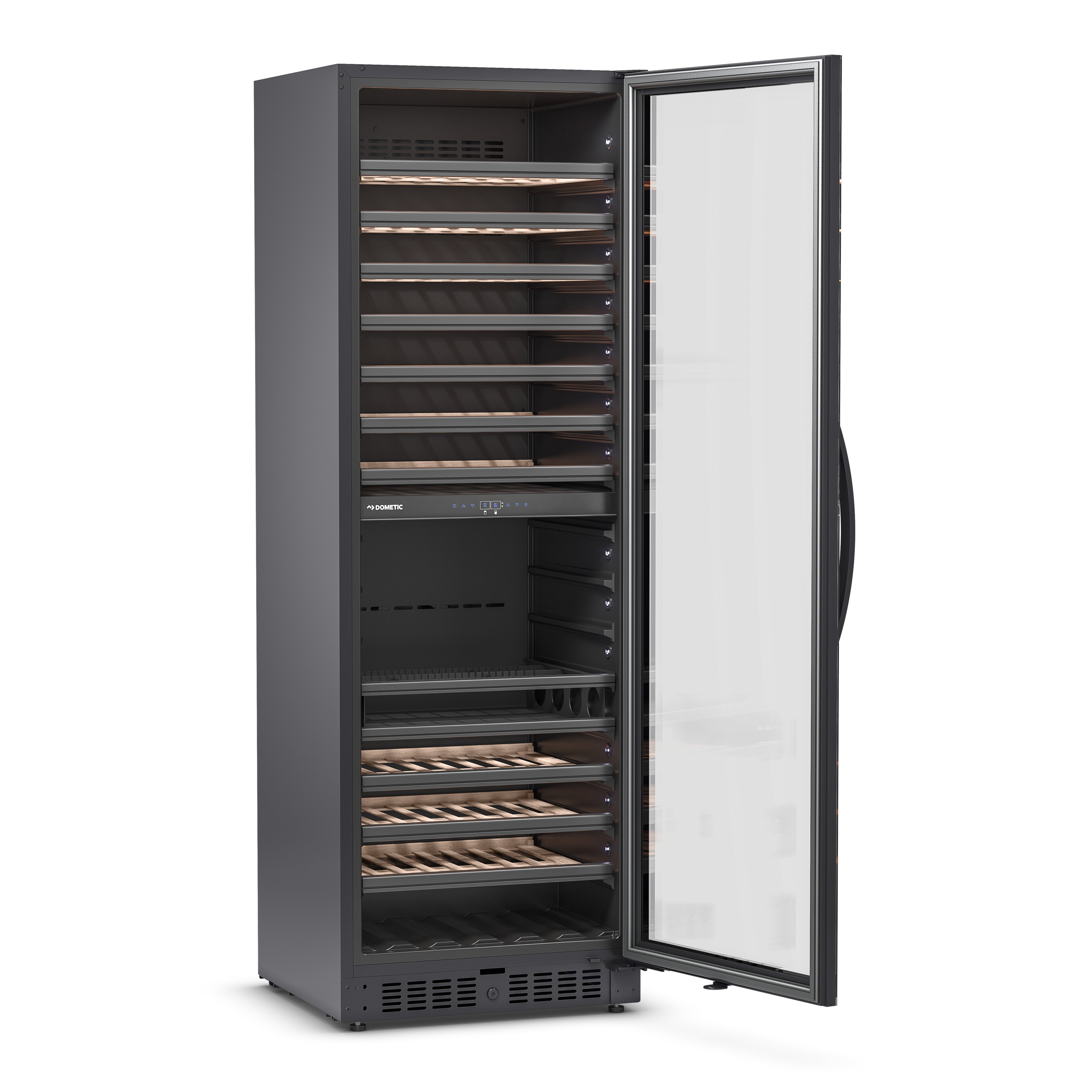 Não é por acaso que os vinhos se apresentam quase sempre em garrafas de vidro coloridas: são extremamente sensíveis à luz. Os raios UV influenciam significativamente o processo de envelhecimento de um vinho. Provocam reações químicas que resultam em perda de aroma. Bastam umas semanas numa sala bem iluminada para o sabor e o aroma do que antes era um bom vinho serem negativamente afetados. Ainda mais prejudicial do que a luz artificial é a luz solar direta, que também gera calor. Isto explica porque todos os refrigeradores de vinho de porta de vidro da Dometic estão equipados com portas especiais de alto isolamento revestidas com um filtro de luz UV para proporcionar proteção máxima. Para melhorar o efeito de isolamento, é injetado gás árgon entre as camadas de vidro da porta. Além disso, nos seus refrigeradores de vinho a Dometic usa exclusivamente luzes LED, pois geram o nível de calor mais baixo possível.