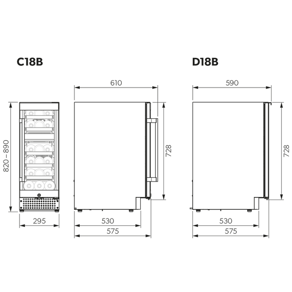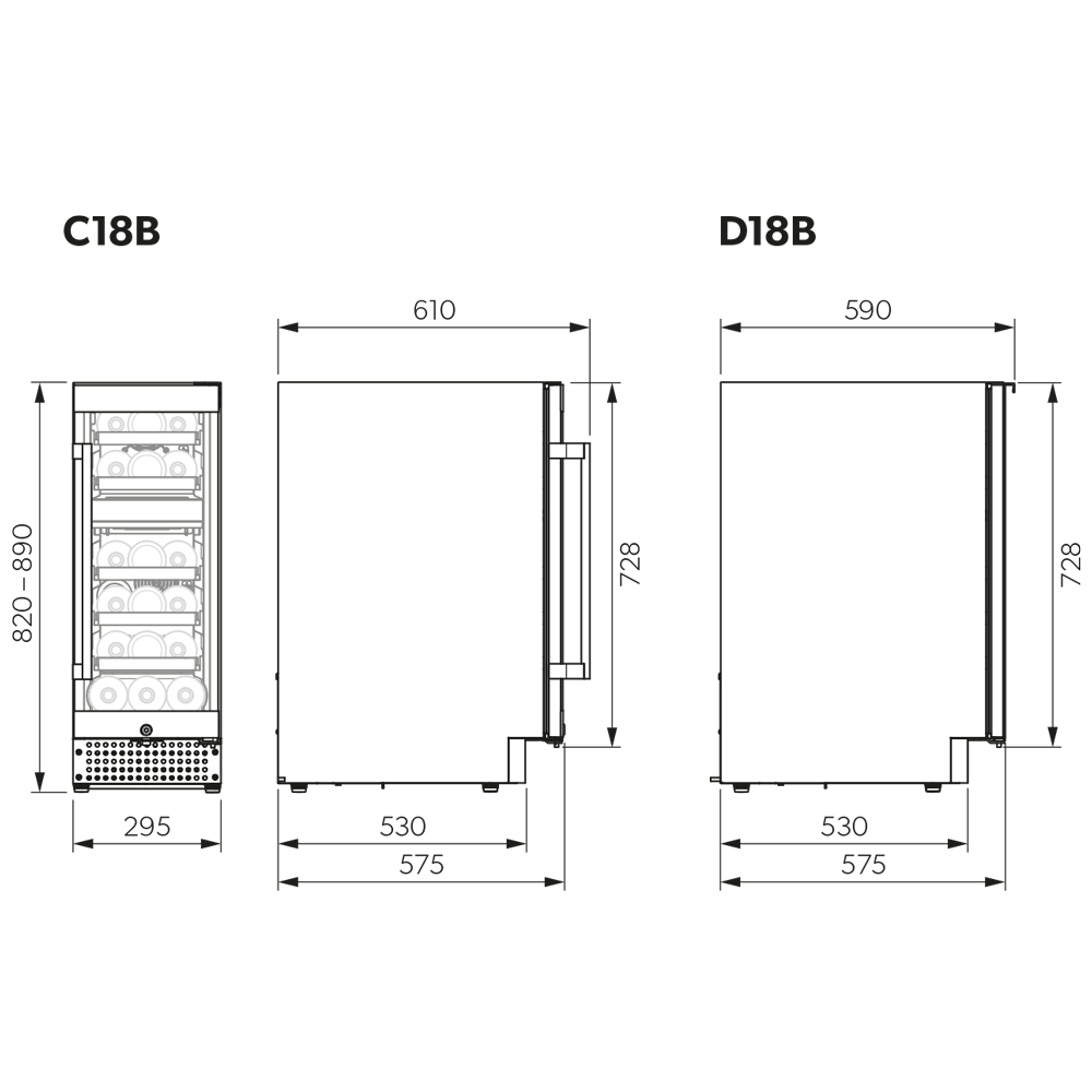 - Adega independente ou com compressor embutido com capacidade para 18 garrafas
