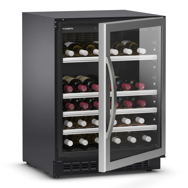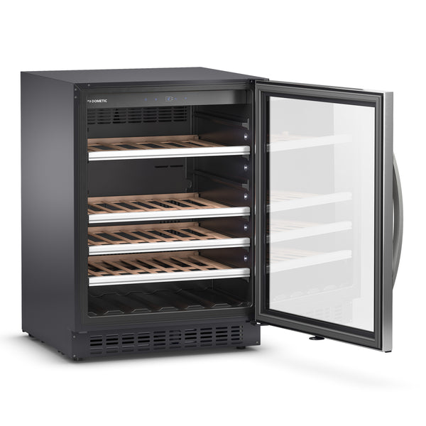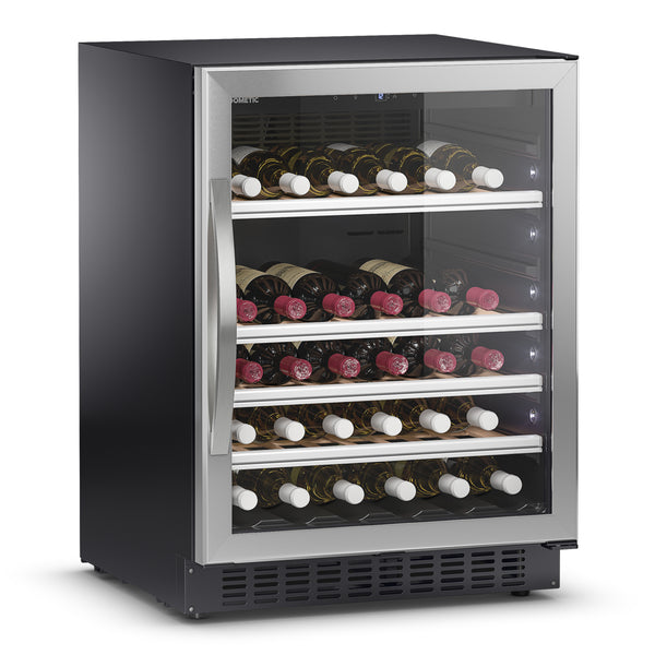 Além de um excelente armazenamento de vinho, o C50G da Dometic reforça o visual de qualquer restaurante ou bar de hotel. Design clássico com uma porta de vidro em aço inoxidável de 2 camadas e LED branca ao longo de toda a altura do interior. Armazena até 50 garrafas de vinho à temperatura de consumo perfeita – fácil de aceder com 4 prateleiras deslizantes de madeira. Com a sua perfeita tecnologia de aquecimento e refrigeração, a temperatura escolhida é rapidamente alcançada e mantida de forma fiável. E 1 sistema de circulação de ar eficaz, combinado com 1 reservatório de água, cria um ambiente perfeito para o seu vinho desenvolver todo o potencial. Extras opcionais: prateleira de apresentação, prateleira deslizante, gaveta de servir e conjunto de etiquetas.