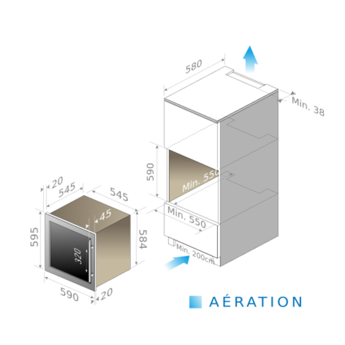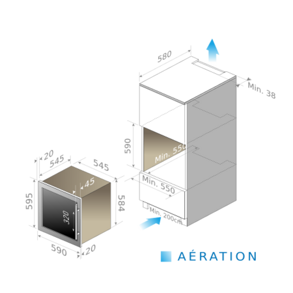 • Abertura de 60 cm: altura de montagem no espaço de um gabinete de coluna correspondente a uma instalação de forno padrão.