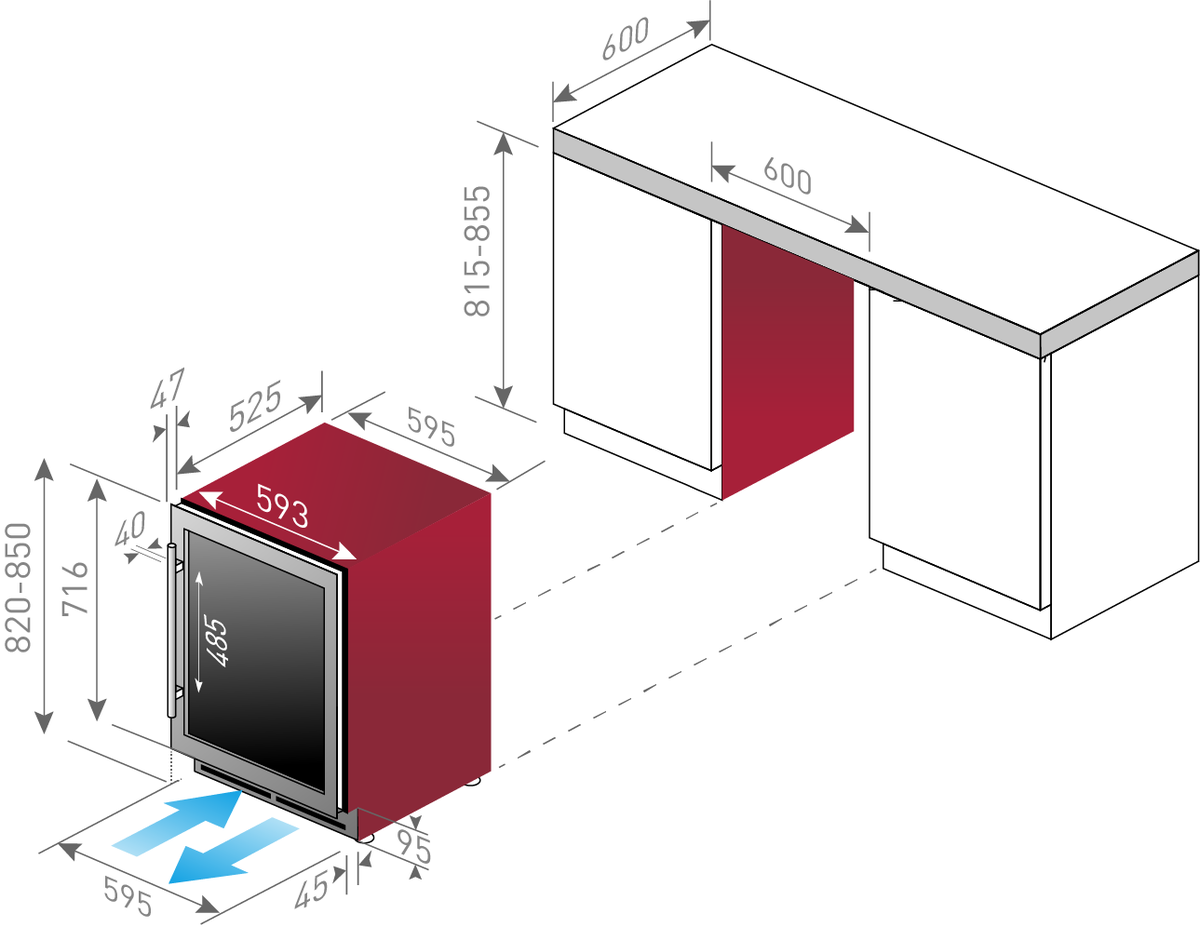 • 82 cm sob o balcão: Altura mínima sob o balcão da porta com uma altura de 72 cm.