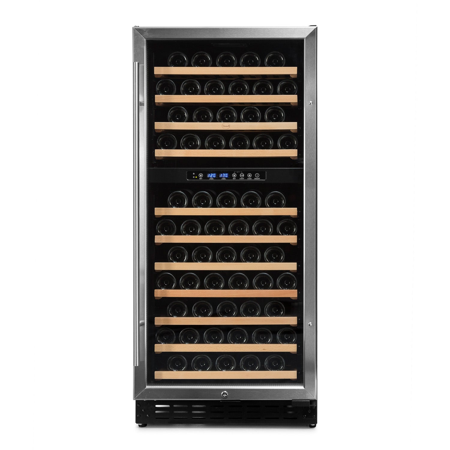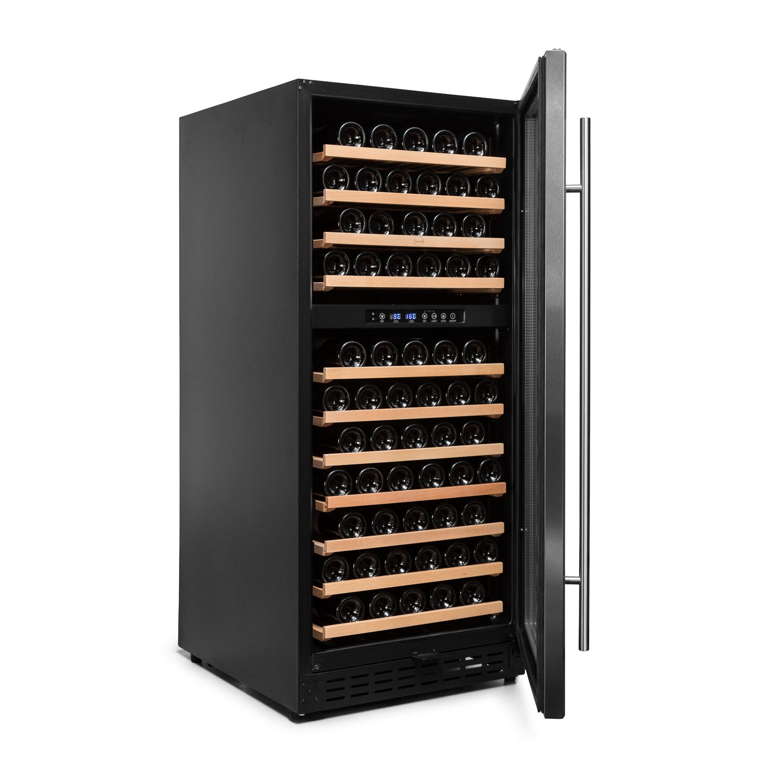 Armazene seus vinhos com estilo. Capacidade de 120 garrafas, duas zonas de temperatura independentes e controle digital. Porta reversível, resfriamento por compressor e sistema no-Frost. Design elegante em aço inoxidável.