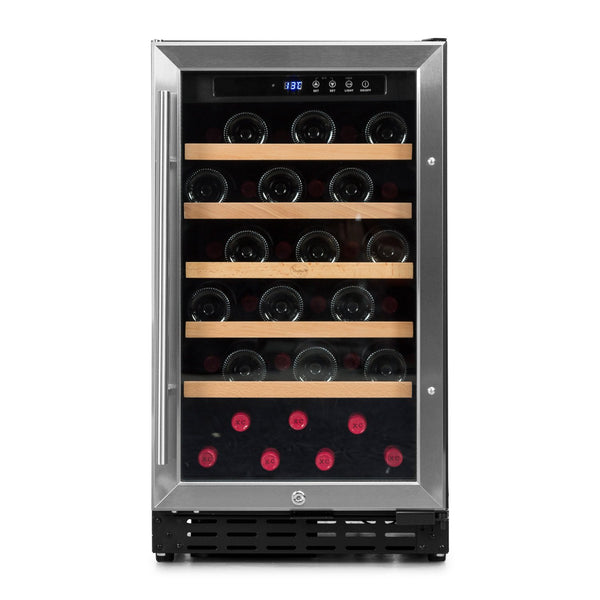 Armazene seus vinhos com estilo. Capacidade de 37 garrafas, ajuste de temperatura de 5º a 18º C e humidade constante de ≥ 65%. Porta reversível com vidro duplo anti-UV, visor digital, iluminação interna e fechadura. Design elegante em aço inoxidável.