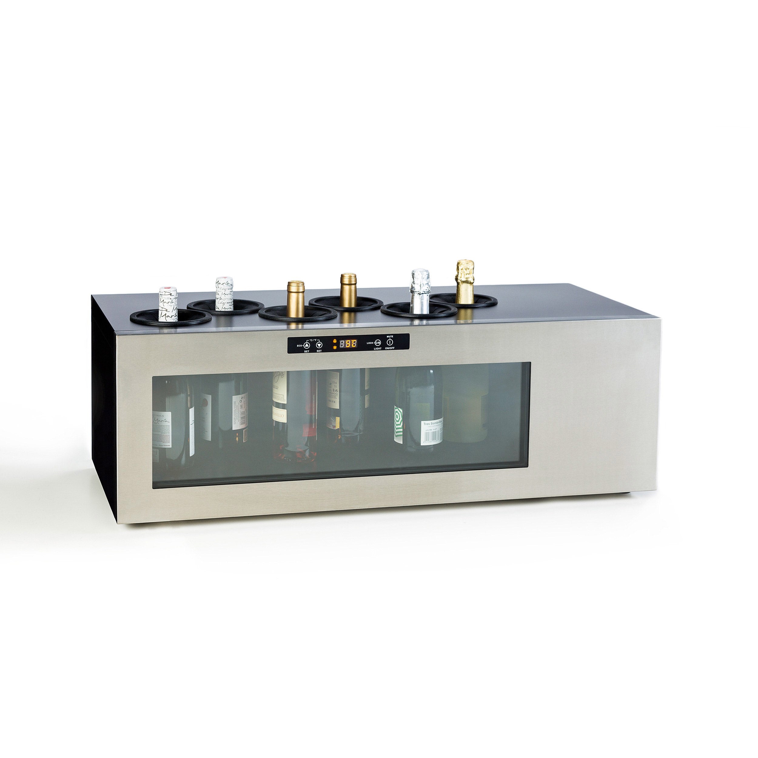 Refrigerador de vinho em aço inoxidável perfeito para restauração: hotéis, restaurantes e bares. Concebido para 6 garrafas de vinho com um diâmetro superior a 11,5 cm: adequado para garrafas de Champagne e Magnum, bem como vinhos tintos e brancos. Atinge temperaturas de 5 a 20ºC o que o torna ideal para vinhos brancos e tintos. Graças ao resfriamento do compressor, não é afetado pela temperatura ambiente. Os vinhos estarão sempre no refrigerador na temperatura selecionada.
